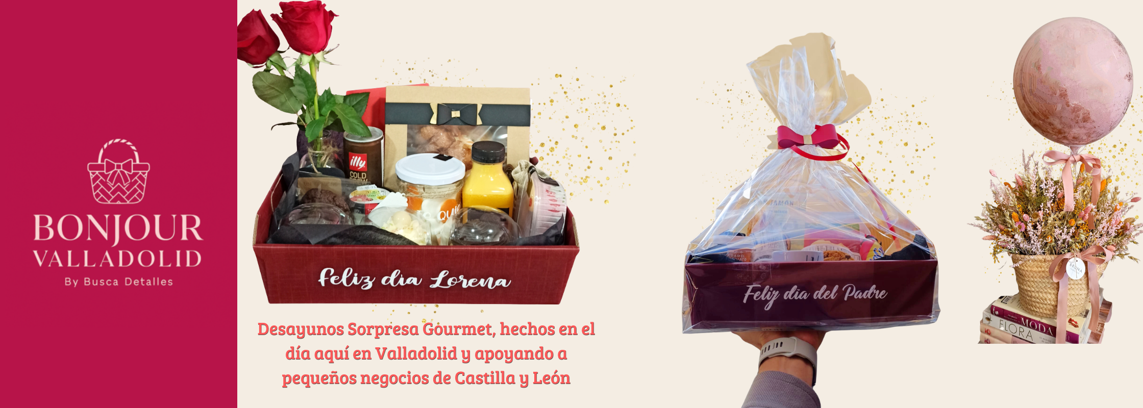 Bonjour Valladolid forma parte de Busca Detalles. Con el crecimiento de Busca Detalles a regalos personalizados, cestas y capazos con envío a toda España, la parte de desayunos sorpresa solo para Valladolid necesitaba separarse, misma filosofía pero marca diferente. Por eso en 2025 nace Bonjour Valladolid