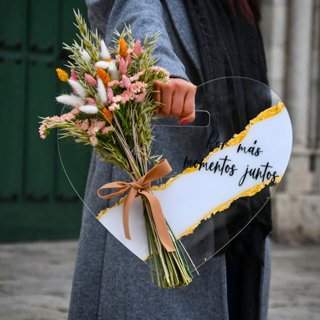 ¡El regalo estrella de Aniversario, amor o San Valentín! Un corazón de metacrilato que cortamos manualmente, lo decoramos y personalizamos también a mano con la frase, corta, que elijas y además le añadimos flores preservadas. Un regalazo!!! Original y que después de regalar será para toda la vida, ya que las flores son preservadas. Se puede colgar