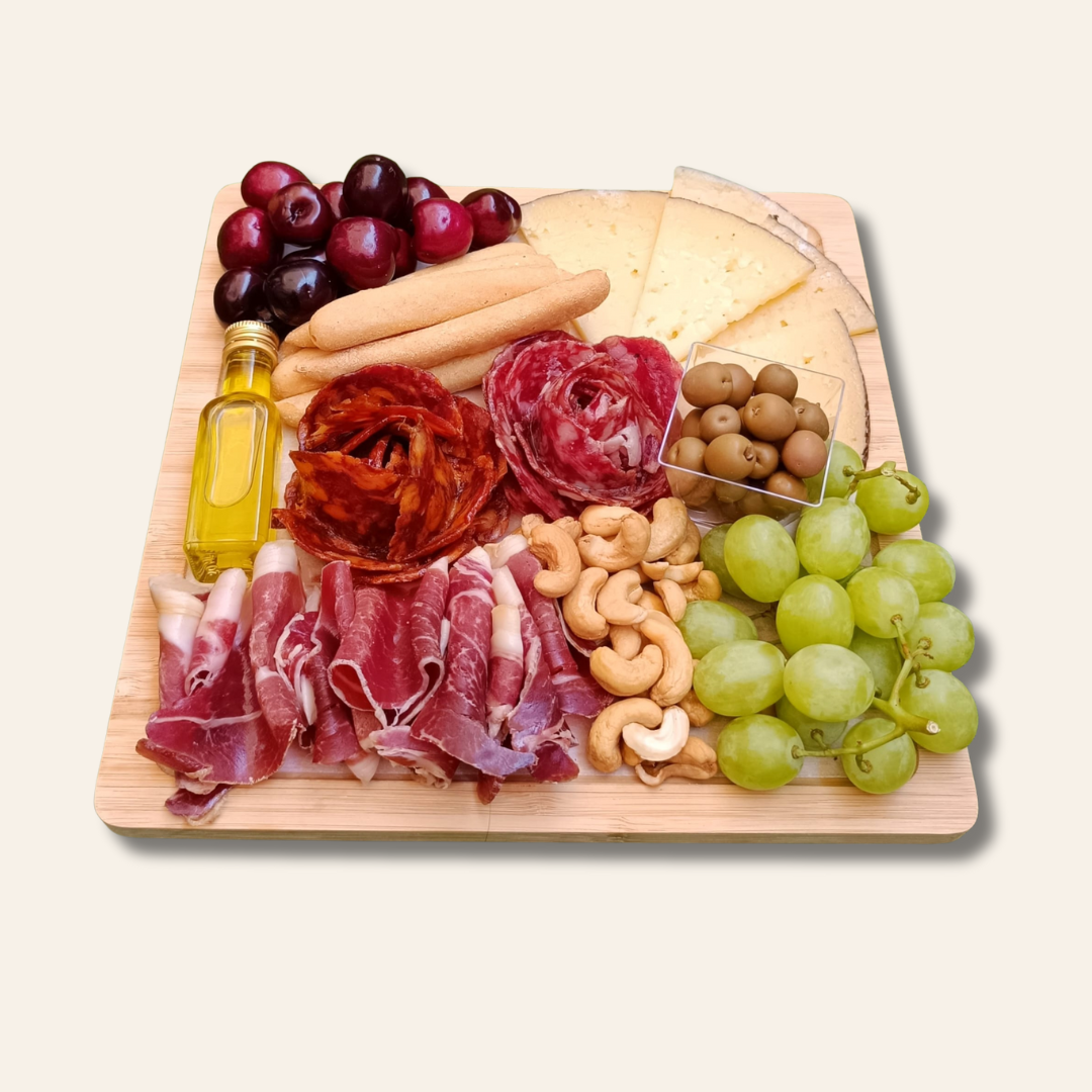 Incluye una variedad de embutidos ibéricos como chorizo, salchichón y jamón serrano reserva, quesos con carácter (curado y mezcla de vaca y oveja), picos crujientes y aceitunas, acompañados por frutos secos (anacardos), frutas frescas de temporada y un toque de excelencia con aceite de oliva virgen extra.