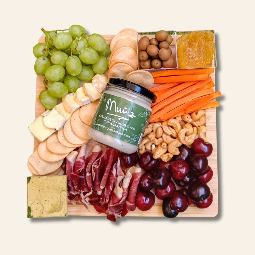 Esta tabla incluye una cuidada selección de frutas frescas de temporada, quesos cremosos como el Brie y nuestra crema de queso artesanal (a las finas hierbas o con un toque de verdejo), jamón serrano reserva de alta calidad, hummus con aguacate, zanahoria fresca para dipear, aceitunas, mermelada artesana, anacardos y crackets crujientes con aceite de oliva y parmesano.